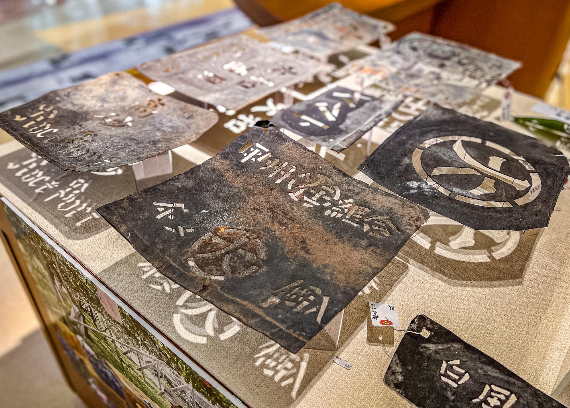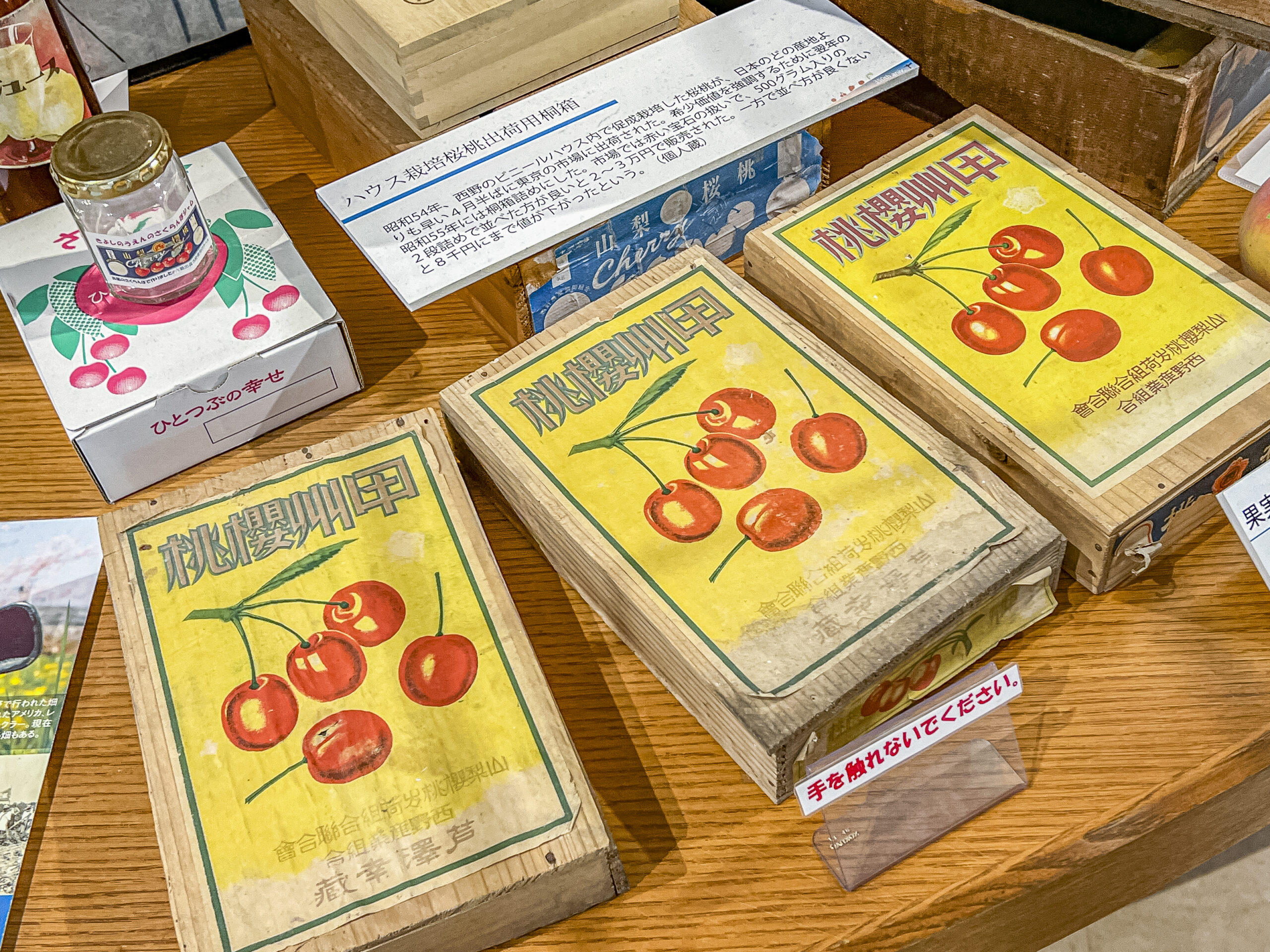 展示している資料も、地元の方々からの協力があって、とても充実したものになっています。写真は、果実出荷箱用のプリント金型です。屋号や所属する組合の銘、品種と重量を印字するのに使用していました。段ボールが主流になる前の昭和39年頃までは使わていたようです。台に直に置くのではなく、少し浮かせて照明で影ができるように展示されているのも粋な気がします。
