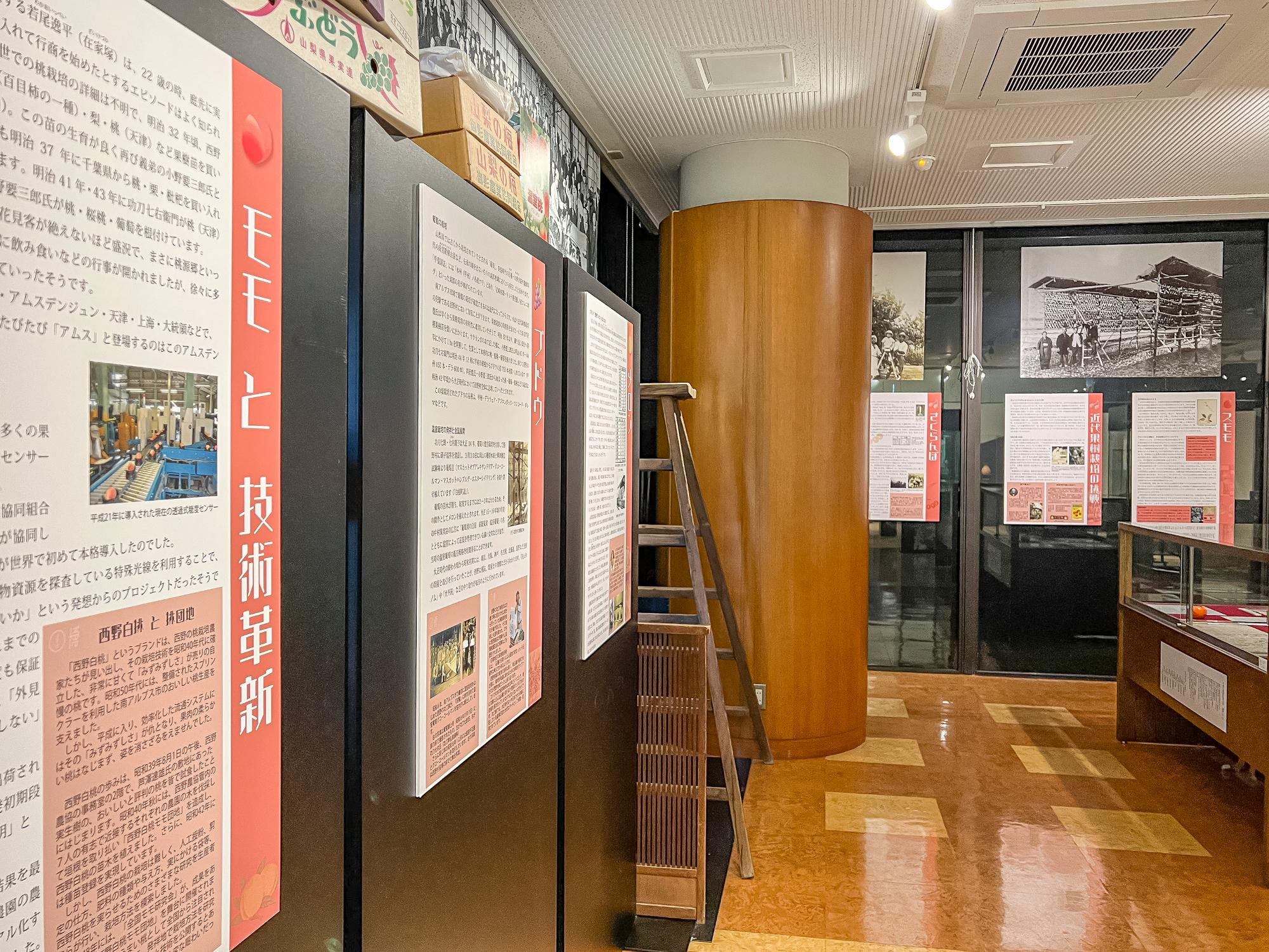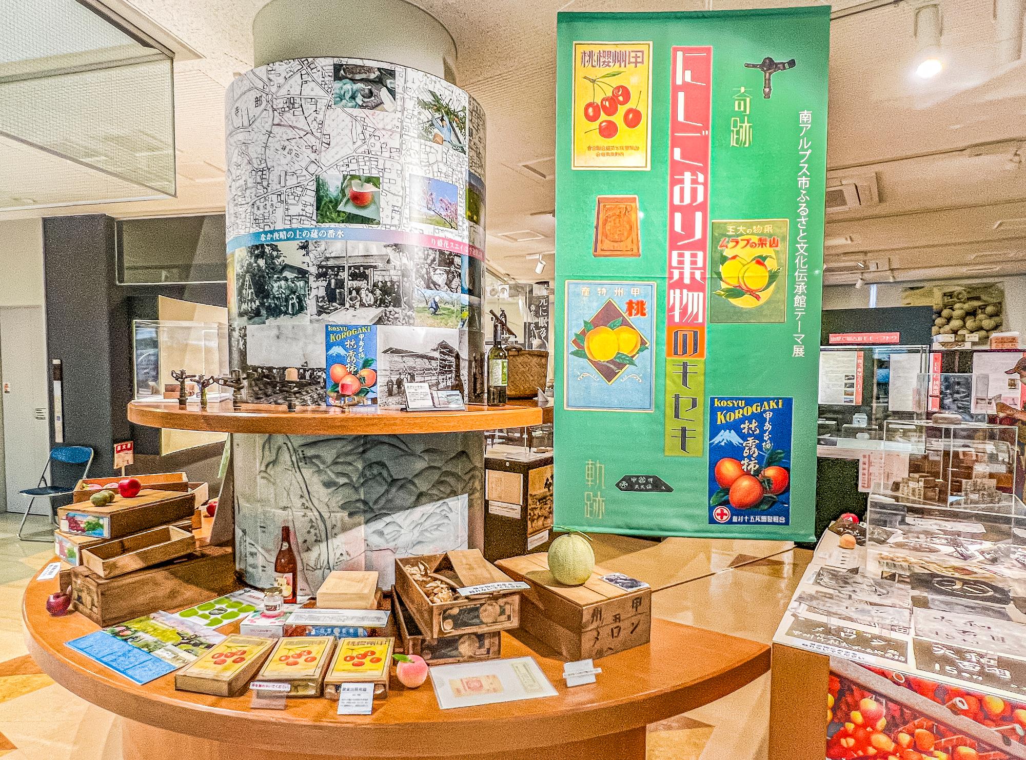 一階展示室には、パネルでの解説の他に貴重な資料が展示されていて、古くからの南アルプス市のフルーツとの関わりを紹介しています。筆者も、ぶどう・桃が弥生時代から存在していると初めて知りました。