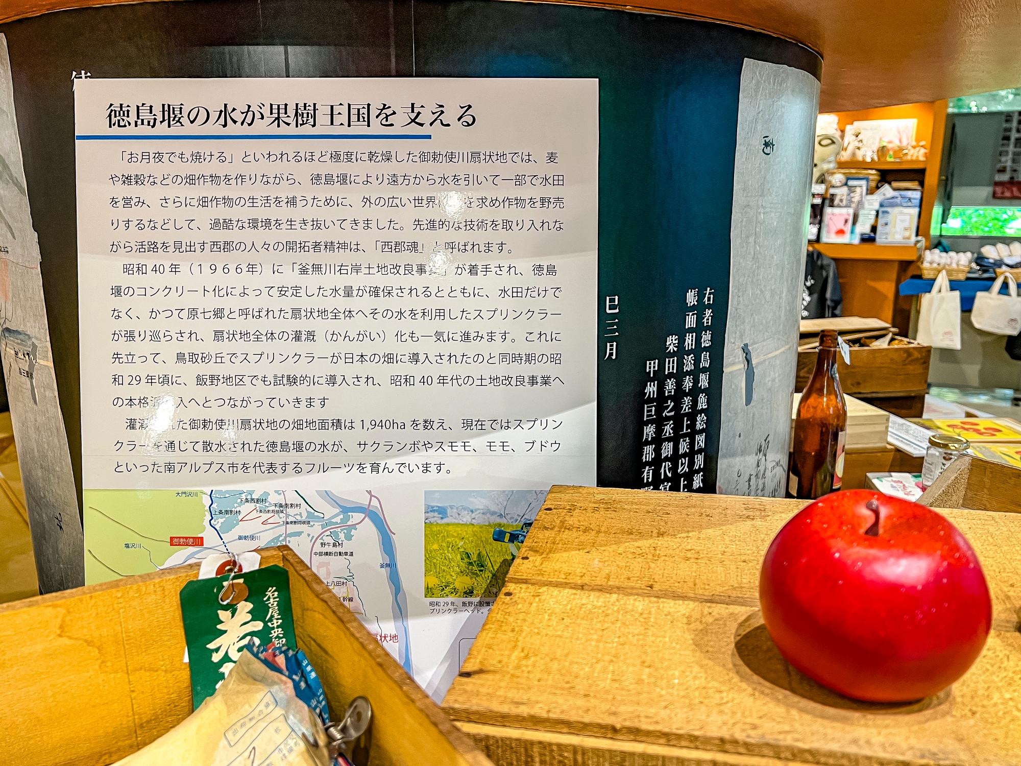 同じフロア内には、市内の果樹栽培に欠かすことができない「徳島堰」も紹介されています。先人の水との闘いを経て現在のフルーツ王国に至る歴史についてよく知ることができます。色々知ると地域を見る目が変わり楽しみが増えます。上の写真は現在の徳島堰です。春には桜並木が見事です。