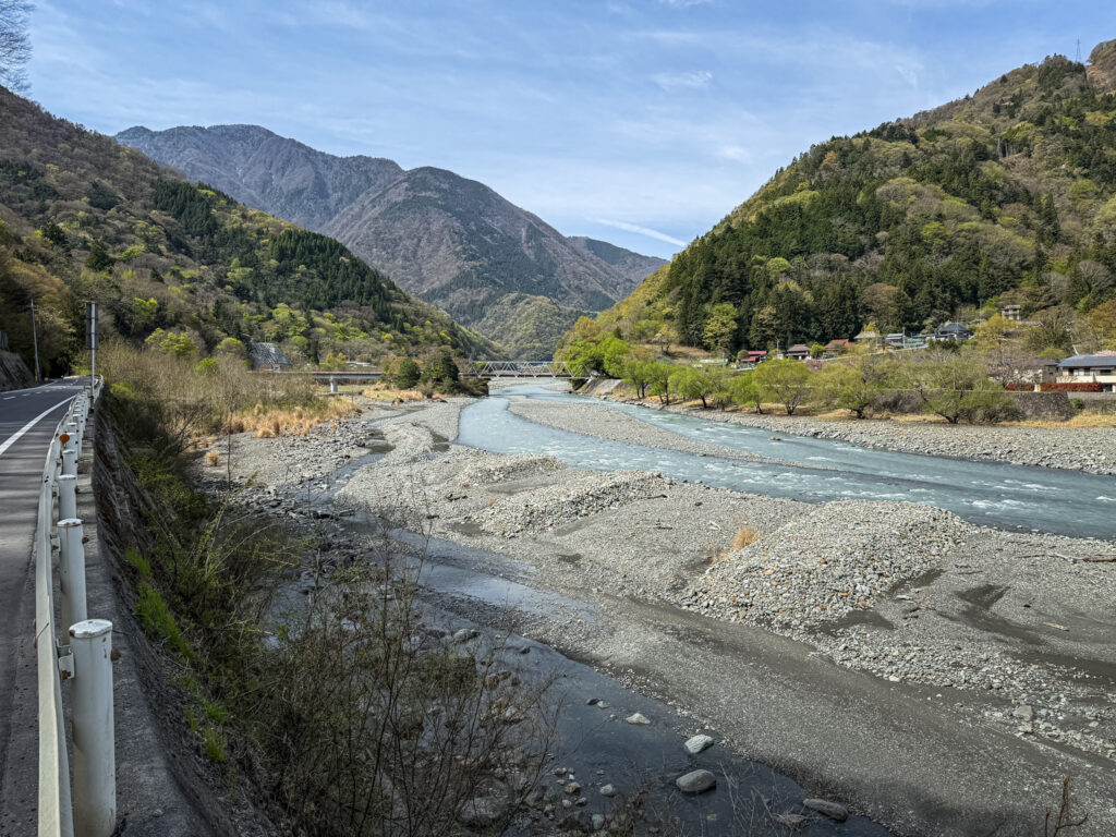 「日本一人口の少ない町」として有名な、山梨県南巨摩郡早川町。県の南西部に位置して、メインの道が県道37号南アルプス街道のみ。災害が発生すれば陸の孤島と化してしまう、そんな厳しい土地柄ですが、街道沿いから望む景色は季節ごとに奥深い南アルプスを楽しむことができます。ついこの間4月になったばかりですが、既に桜は殆ど散ってしまい、山肌は萌黄色に変わりつつあります。