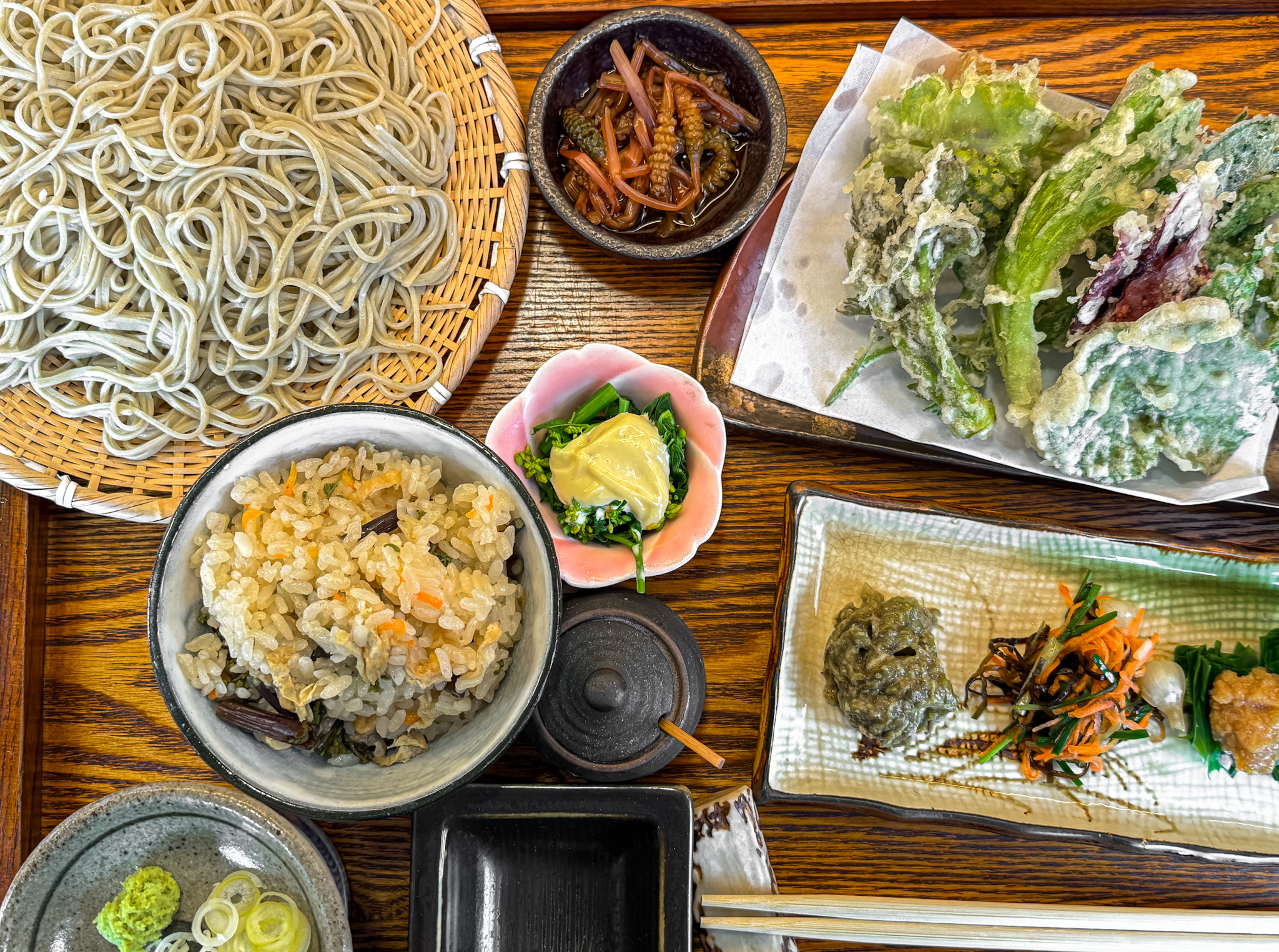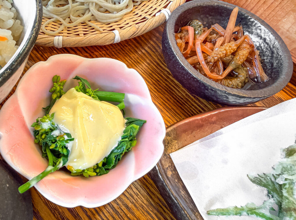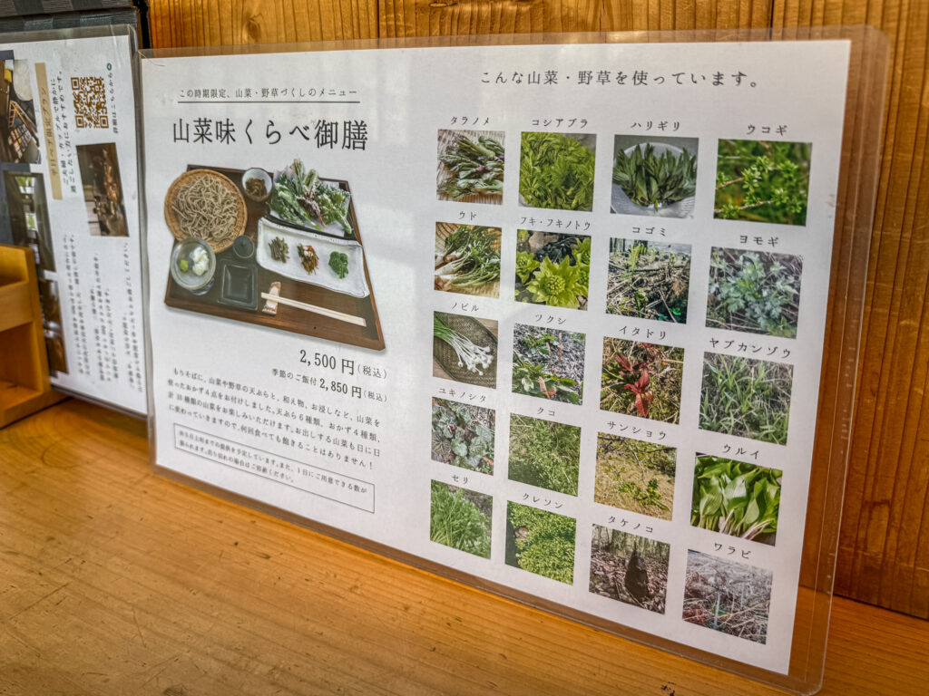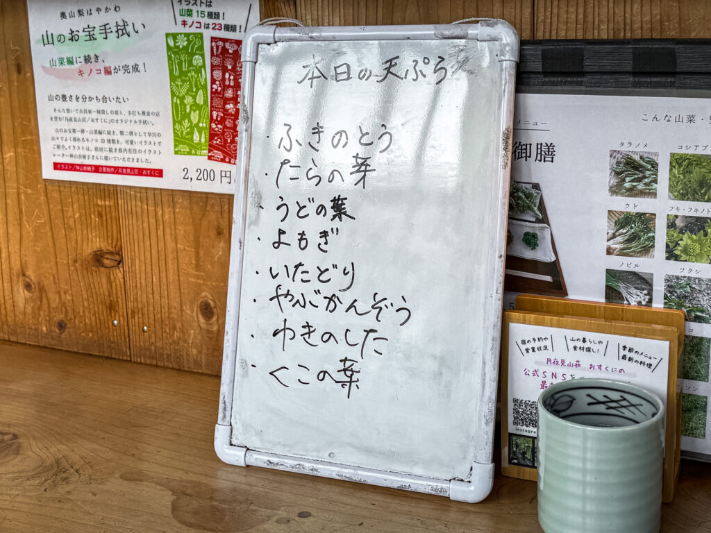 今回のお目当ては決まっていました。早川町の春の味覚の山菜!おすくにさんの山菜味くらべ御膳(ご飯付き+麺大盛り¥3150税込)!これが目当てで毎年お邪魔しています。