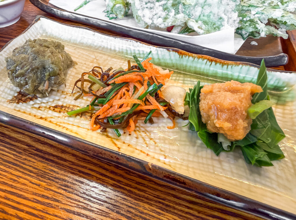今回、天ぷらにされた山菜。天然のものなので時期によって内容は変わります。それがまた楽しみでもあります。苦味と旨味の絶妙なバランスで、特製の塩でいただきます。