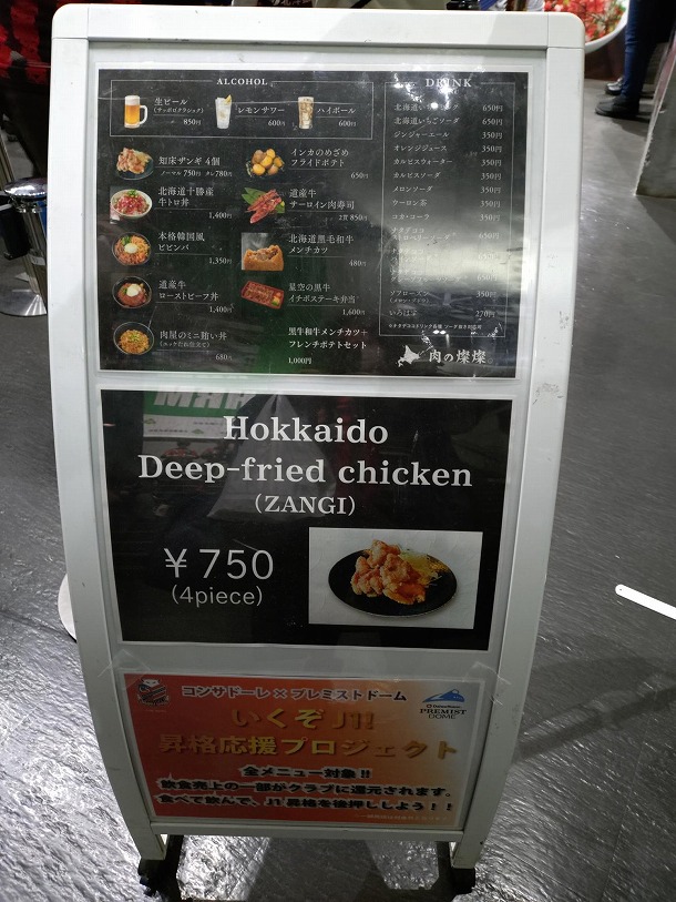 新しいお店が登場したということは、残念ながらさよならしたお店もあります。ケンタッキーフライドチキンがドーム内からなくなりました。これは、正直いってショックでした。ケンタッキーは、コンサドーレの試合の時にドームでしか食べられないチキン丼などが販売されていたんですよ。とはいえ、悲しんでいても仕方がないので、新しいお店の紹介をしたいと思います。コンサドーレのホーム開幕戦で見てきました。